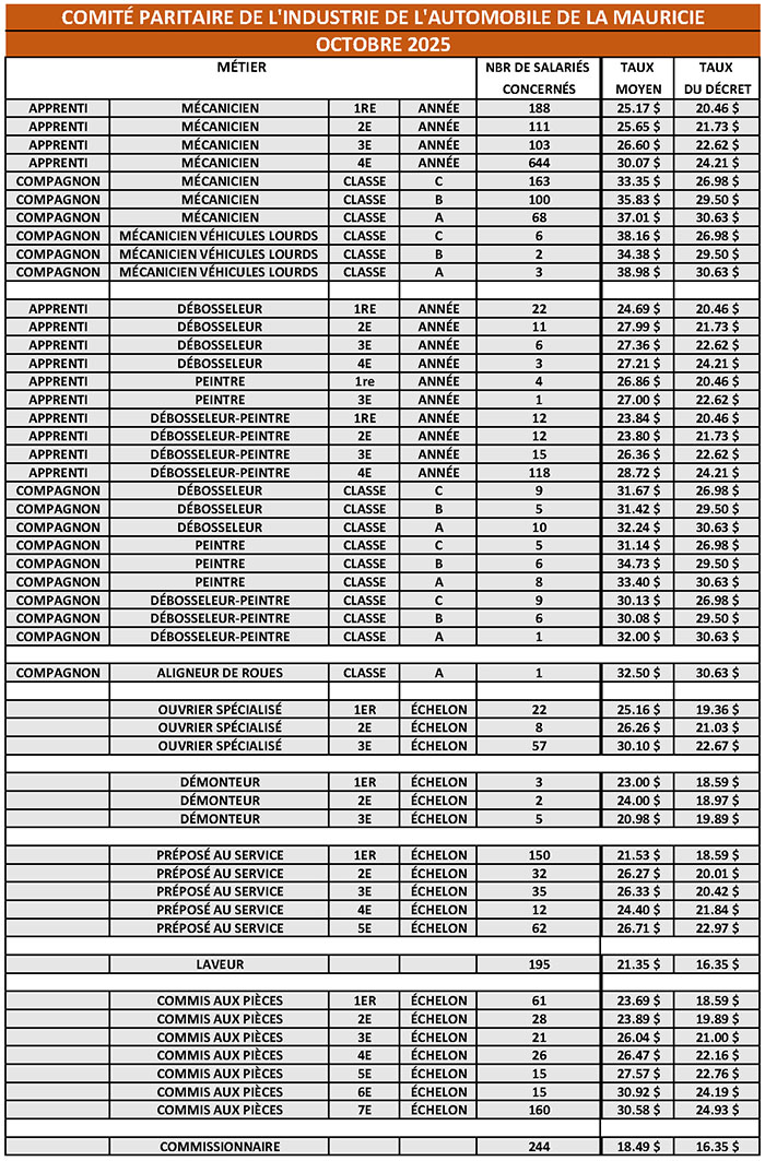 SALAIRES MOYENS DE L’INDUSTRIE TAUX DE SALAIRE MOYEN DANS L’INDUSTRIE DES SERVICESAUTOMOBILES DES RÉGIONS DE DRUMMOND ET DE LA MAURICIE Basé sur le mois d’octobre 2025